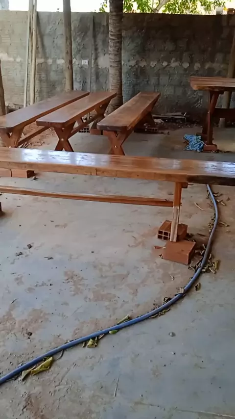 mais uma encomenda Concluída já na casa do cliente passando verniz mesas de prancha madeira de Angeli pedra 🙌 #marcenaria