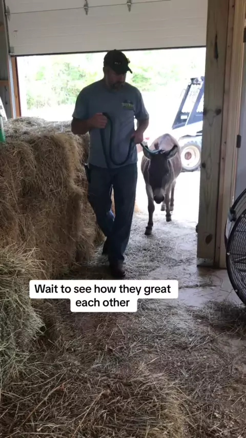 Isso foi depois que Barney foi castrado em 2019. E precisou ficar 45 dias separado. Então, nós o tínhamos em outra fazenda. Betty é a mãe de seus bebês Bam Bam e Melvin. Nós o introduzimos lentamente de volta aos outros. Vou acrescentar aqui que sempre usamos cabrestos. Mas o marido tinha deixado o cabresto na outra fazenda, eu acho. Nós não poderíamos simplesmente deixá-lo aqui, pois tudo isso era novo para ele. Pouco quando precisamos andar com eles com uma liderança, sempre usamos um cabrest...