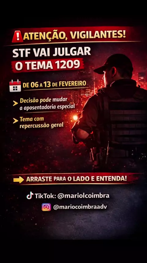 🚨 ATENÇÃO, VIGILANTES! O STF vai julgar o Tema 1209, uma decisão que pode mudar completamente a aposentadoria especial dos vigilantes em todo o Brasil. 📅 O julgamento está previsto para acontecer entre os dias 06 e 13 de fevereiro, no plenário virtual do Supremo Tribunal Federal. ⚖️ O Tema 1209 discute se o RISCO PERMANENTE à integridade física, característico da atividade de vigilante, pode ser reconhecido como tempo especial.
