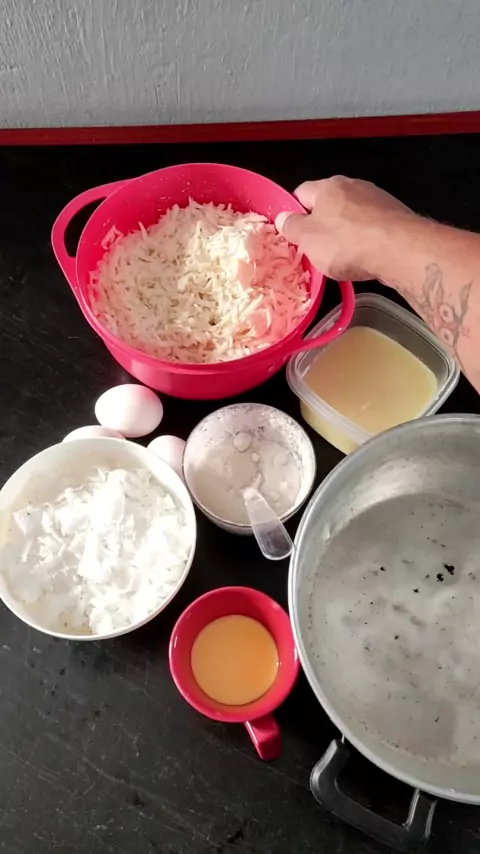 #Receita #bolodemacaxeira #bolo #receitanordeste Ingredientes. 1kg de macaxeira ralada crua 1 coco ralado a mão 2 colheres de margarina derretida 1 caixa de leite condensado 2 colheres de sopa de açúcar uma pitada de sal. Misture todos os ingredientes bem e depois coloque uma em forma untada, leve ao forno pré aquecido 180° por 40 minutos ou até dourar toda parte de cima do bolo. fica uma delícia 😋😍