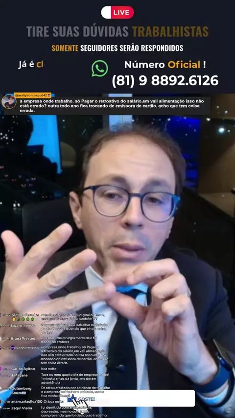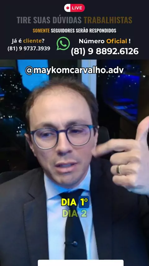 Você tem dúvidas trabalhistas e não sabe por onde começar? 🤔💼 No vídeo de hoje, estou ao vivo tirando dúvidas reais e explicando, de forma simples, aquilo que a maioria dos trabalhadores não sabe que tem direito. 👉 Deixe sua pergunta nos comentários e já siga o perfil para ser respondido! 📲 Quer atendimento direto? Chame no WhatsApp do número oficial que está no vídeo. #maykomcarvalhoadv #advogadotrabalhista #DireitoTrabalhista #DúvidasTrabalhistas #AdvogadoTrabalhista