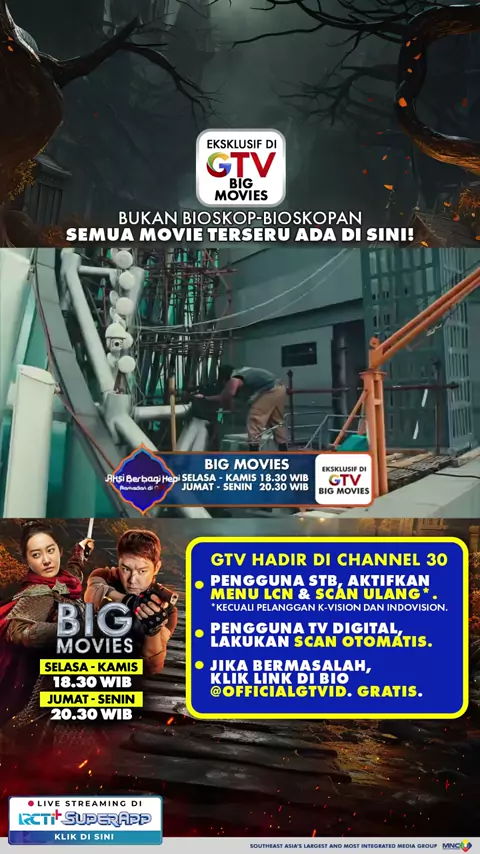 Film-film terbaik siap nemenin harimu! 🎬 Stay tuned di GTV karena BIG MOVIES tayang setiap hari! 📺 BIG MOVIES 🗓️ Selasa–Kamis | 18.30 WIB 🗓️ Jumat–Senin | 20.30 WIB 📡 Eksklusif di GTV Jangan berkedip. Karena yang besar, selalu bikin deg-deg-an! 😎🔥 GTV Hadir di CHANNEL 30, ikuti cara mudahnya: • Aktifkan LCN lalu scan ulang STB Kamu • Scan otomatis TV Digital #JagonyaFilm #BigMoviesGTV #GTV