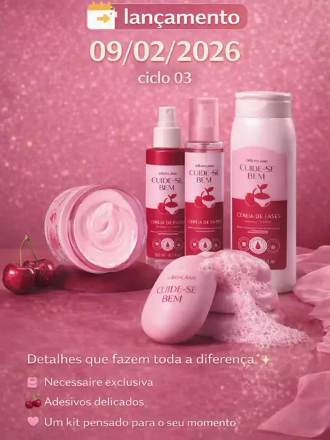 Cuide-se Bem Cereja de Fases (lançamento) 🍒✨ Chegou o lançamento mais fofo e irresistível! Cuide-se Bem Cereja de Fases: hidratação, perfume delicado e aquele toque especial que transforma seu momento de autocuidado. Corre garantir o seu antes que acabe 💕🔥 #Lancamento #CuideSeBem #CerejaDeFases #OBoticario #SkincareCorporal