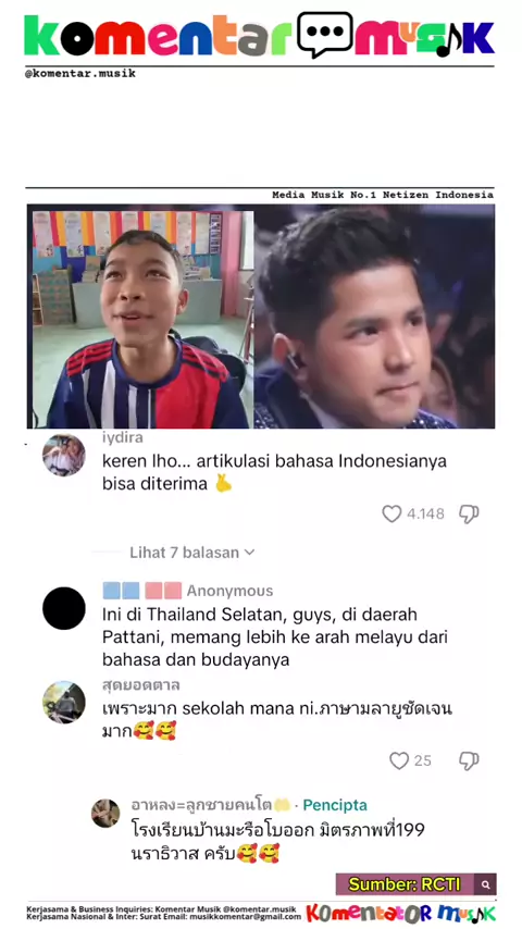 Orang Thailand Selatan Viral Nyanyikan Lagu Pop Indonesia, Netizen Soroti Artikulasi Seorang anak asal Thailand Selatan mendadak viral di media sosial setelah tampil menyanyikan lagu pop berbahasa Indonesia dengan pelafalan yang dinilai sangat jelas. Video tersebut ramai dibagikan ulang oleh berbagai akun hiburan, termasuk akun “Komentar Musik”, dan menuai respons positif dari warganet Indonesia. Dalam cuplikan video, anak tersebut tampak percaya diri menyanyikan lagu Indonesia dengan artikulas...
