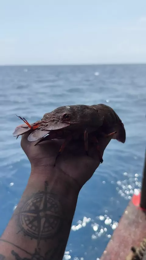 O animal marinho na imagem é provavelmente um cavaco (gênero Scyllarides), também conhecido como lagosta-sapateira ou cigale de mer, um crustáceo que se distingue pela ausência de garras grandes e antenas largas e achatadas. Eles pertencem à família Scyllaridae. São considerados um marisco de excelência e, em algumas regiões, são raros devido à sobrepesca. Os adultos podem atingir até 30 cm de comprimento. É um animal diferente e pode ter uma carapaça espinhosa transparente quando jovem.