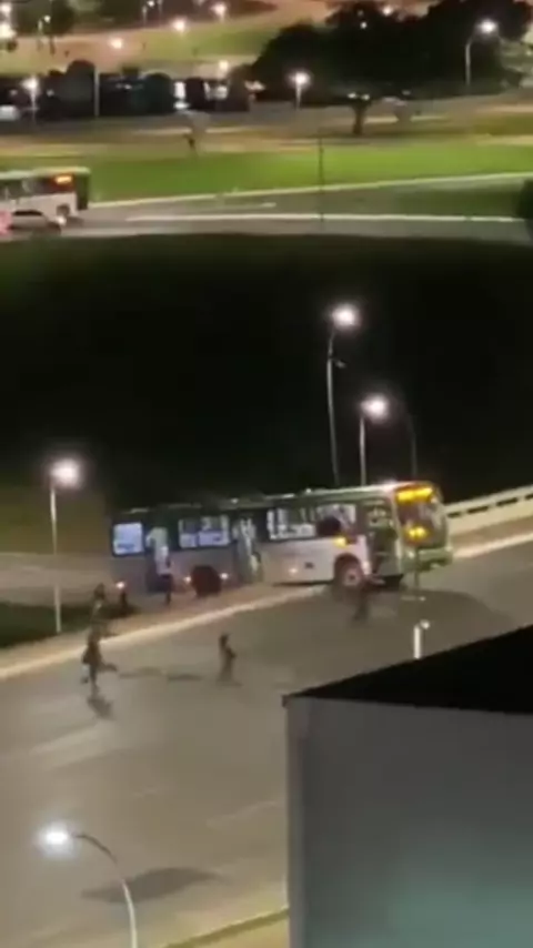 Imagens mostram manifestantes tentando jogar um ônibus de um viaduto em Brasília durante as violentas manifestações realizadas nesta segunda-feira (12). Quatro ônibus foram incendiados e dezenas de veículos destruídos fonte: metrópoles #noticias #noticiasocial #viral #fy #kwai
