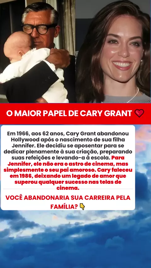 cary grant pai dedicado Em 1966, aos 62 anos, Cary Grant abandonou Hollywood após o nascimento de sua filha Jennifer. Ele decidiu se aposentar para se dedicar plenamente à sua criação, preparando suas refeições e levando-a à escola. Para Jennifer, ele não era o astro de cinema, mas simplesmente o seu pai amoroso. Cary faleceu em 1986, deixando um legado de amor que superou qualquer sucesso nas telas de cinema.