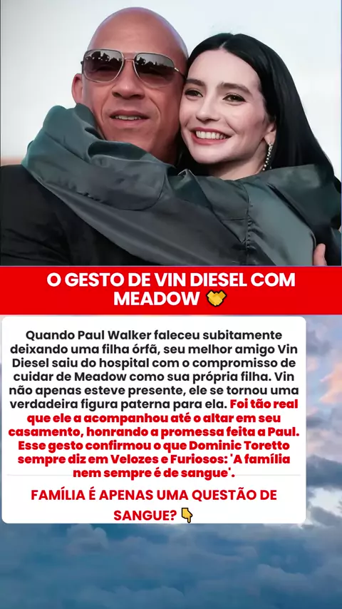 Vin Diesel Honra Promessa a Paul Quando Paul Walker faleceu subitamente deixando uma filha órfã, seu melhor amigo Vin Diesel saiu do hospital com o compromisso de cuidar de Meadow como sua própria filha. Vin não apenas esteve presente, ele se tornou uma verdadeira figura paterna para ela. Foi tão real que ele a acompanhou até o altar em seu casamento, honrando a promessa feita a Paul. Esse gesto confirmou o que Dominic Toretto sempre diz em Velozes e Furiosos: 'A família nem sempre é de sangue'