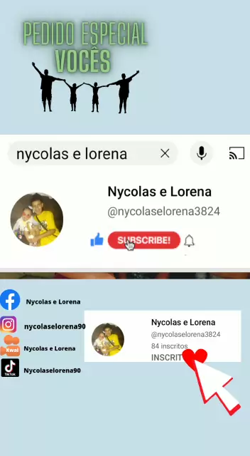 E aí pessoal somos a Lorena e o Nycolas. estamos tentando realizar nosso sonho em ser YouTubers nós ajude e simples e só se escrever e dar like nós vídeos do YouTube e Kwai nossos vídeo.
