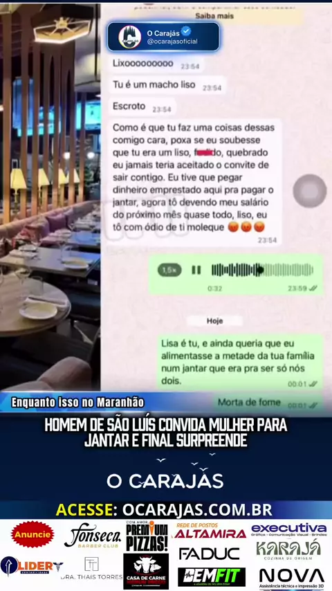 Uma conversa entre um homem e uma mulher viralizou nas redes sociais após um encontro ocorrido em São Luís, no Maranhão. No áudio que circula na internet, o homem afirma que convidou a mulher para um jantar acreditando que seria apenas entre os dois, mas diz ter se surpreendido ao chegar ao local. Durante a conversa, ele demonstra insatisfação com a situação e afirma que, se soubesse como seria o encontro, não teria aceitado pagar a conta. Em outro momento, a mulher diz que não costuma ficar com