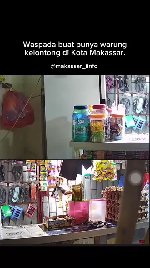 Terekam CCTV aksi pencurian dan pembobolan kios sembako yang berlokasi di Jalan Ujung Bori, Kecamatan Manggala. Peristiwa terjadi pada Rabu, 04 Februari 2026, sekitar pukul 02.45 WITA dini hari. Kronologi: ES, pemilik kios, keluar membeli makanan sekitar pukul 02.30 WITA dengan menggembok pintu kios dari luar. Tak lama berselang, pelaku diduga membobol gembok tersebut dan masuk ke dalam kios. Pelaku kemudian mengambil sejumlah barang berupa rokok, satu unit handphone, serta uang tunai. Mohon ke...