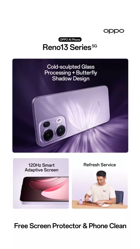 Discover the next level of innovation with the #OPPO Reno13 Series! 🦋 Featuring a stunning Cold Sculpting Glass + Butterfly Design and a smooth 120Hz Smart Adaptive Screen, it’s designed to deliver a flawless visual and performance experience. ✨ And to keep your device looking brand new, we offer a Refresh Service, including a Free screen protector & Phone Cleaning – premium care that ensures lasting performance and beauty! Step into a world of care and performance with #OPPOReno13Series! ?