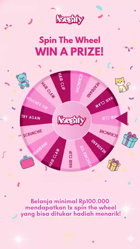 Belanja makin seru bareng Naughty! 💖 Setiap pembelanjaan minimal Rp100.000, kamu bisa spin the wheel dan langsung dapetin hadiah menarik 🎁 Mulai dari voucher, hair accessories lucu, sampai scrunchie & headband gemas! ⠀ 📍 Promo hanya berlaku di ✨ Naughty supermal Karawaci ⠀ Buruan mampir dan cobain keberuntunganmu, bestie! Siapa tahu kamu dapet hadiah favoritmu 💕 #naughtyaccessories #aksesoriswanita