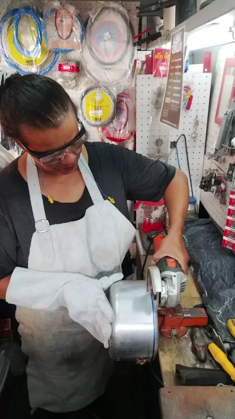 Mostro meu trabalho,digno e honrado,consertando panelas,Cortando panelas ,transformando peças velhas em novas e útil.
