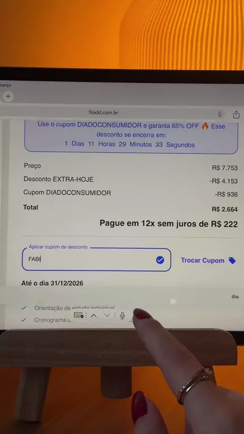 Esse é o maior desconto que a Filadd já liberou e dá pra usar em qualquer plano!!! Além do desconto da turma especial de volta às aulas, o cupom FABI25 garante mais R$1.200 OFF, chegando a 55% de desconto no valor total do curso.