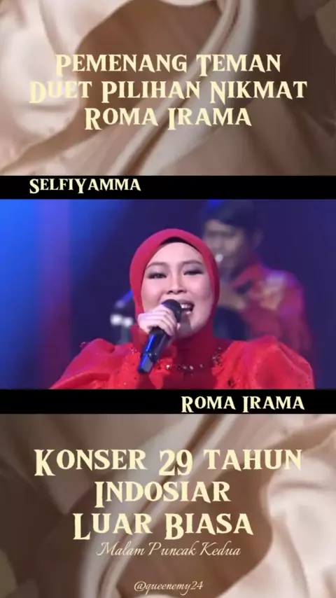wow CONGRATS ratu cengkoknya Indosiar SELFIYAMMA sebagai pemenang ROMA IRAMA MENCARI TEMAN DUET 👏🏻 + dapat hadiah pula sebesar 50 JT ❤️‍🔥 ............................................................... #konser29tahunindosiarluarbiasa #konserraya29tahunindosiar #malampuncakkeduahutindosiar #romairamamencaritemenduet #romairamanikmat #selfiyamma #selfipemenangromairamamencaritemanduet #selfitta #romairama #hut29 #hutindosiar29luarbiasa
