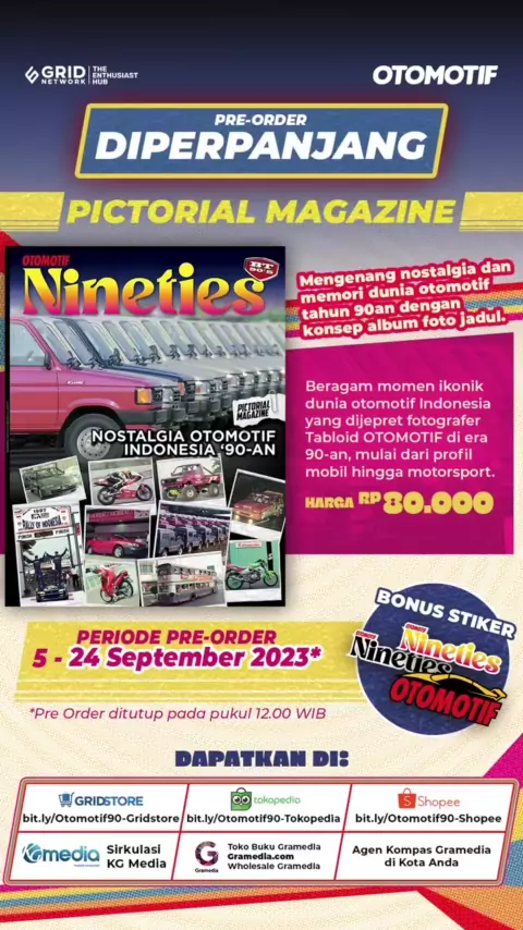 Kabar baik para pecinta otomotif, khususnya dunia otomotif tahun 90-an! Pre-order Otomotif Nineties Pictorial Magazine diperpanjang hingga 24 September 2023 pukul 12.00 WIB! Dengan mengusung konsep album foto jadul, kalian bisa melihat berbagai potret dan profil dari mobil dan motor ikonik pada tahun ‘90-an di Indonesia. Kalian juga bisa melihat berbagai foto-foto tren dan lifestyle mobil pada tahun ’90-an, event motorsport era ’90-an hingga kenangan transportasi pada masa itu yang mungkin bebe...