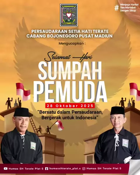 Selamat Hari Sumpah Pemuda 28 Oktober 2025 *“Bersatu dalam Persaudaraan, Bergerak untuk Indonesia”* Persaudaraan Setia Hati Terate Cabang Bojonegoro mengajak seluruh generasi muda warga SH Terate untuk terus menjaga semangat persaudaraan, memperkokoh persatuan, dan menyalakan jiwa perjuangan demi Indonesia yang lebih maju.#humasshterateplats#shteratebojonegoro#harisumpahpemuda#psht#virall