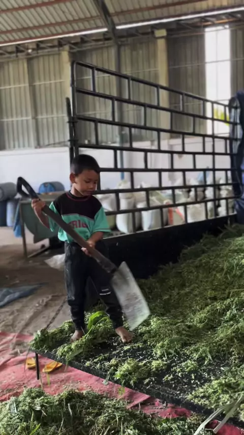Gani bongkar rumput pakcong yang sudah di cacah, untuk dicampur ke konsentrat #peternakmuda #permatasapi #sapi #marpeor #PeternakCerdas