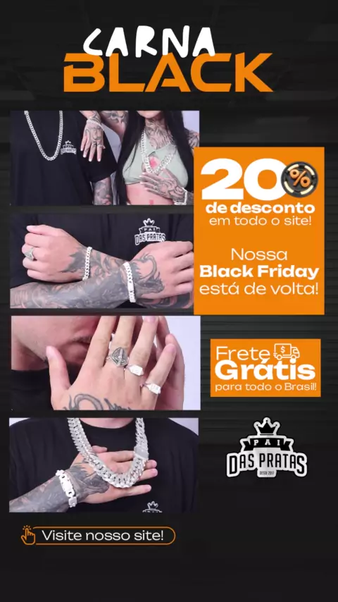 🎉 Aproveite a Carna Black, nossa Black Friday fora de época! 🎉 Descontos imperdíveis aguardam por você! Compre agora e ganhe 20% de desconto + frete grátis para todo o Brasil em todas as suas compras. E não para por aí! Parcelamos tudo em até 5x sem juros no cartão. Não perca essa chance de economizar e garantir seus produtos favoritos. Corra enquanto duram os estoques! #JóiasDePrataMasculinas #PrataParaHomens