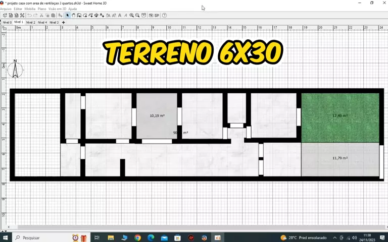 PLANTA PARA TERRENO 6X30 OU MEIO LOTE CASA DE 3 QUARTOS COM 2 BANHEIROS GARAGEM SALA E COZINHA AMPLA. #CONSTRUÇÃO