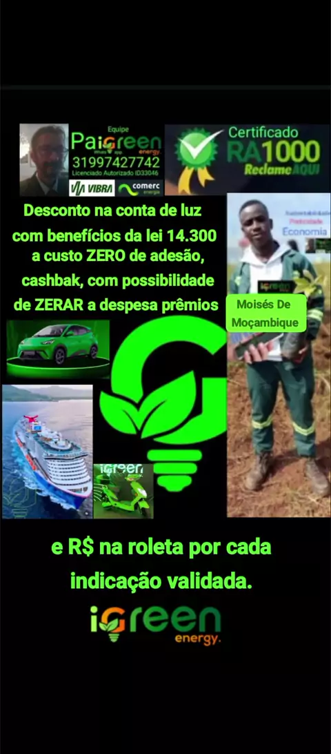 Dona de pastelaria*ZERANDO* a conta. Além de conseguir *ZERAR*a conta de energia elétrica injetada temos descontos em 30.000 estabelecimentos comerciais para compras on-line e ou em loja física em todo país no nosso app igreen Club. *Adesão custo*ZERO sem obras nem mudança de concessionária. A cada indicação validada temos na roleta o cashbak todos os meses,prêmios em $ de R$25.00 a R$500.00 garantido para resgatar no Pix ou número da sorte para o sorteio do BYD DOLPHIN MINI 0 KM.