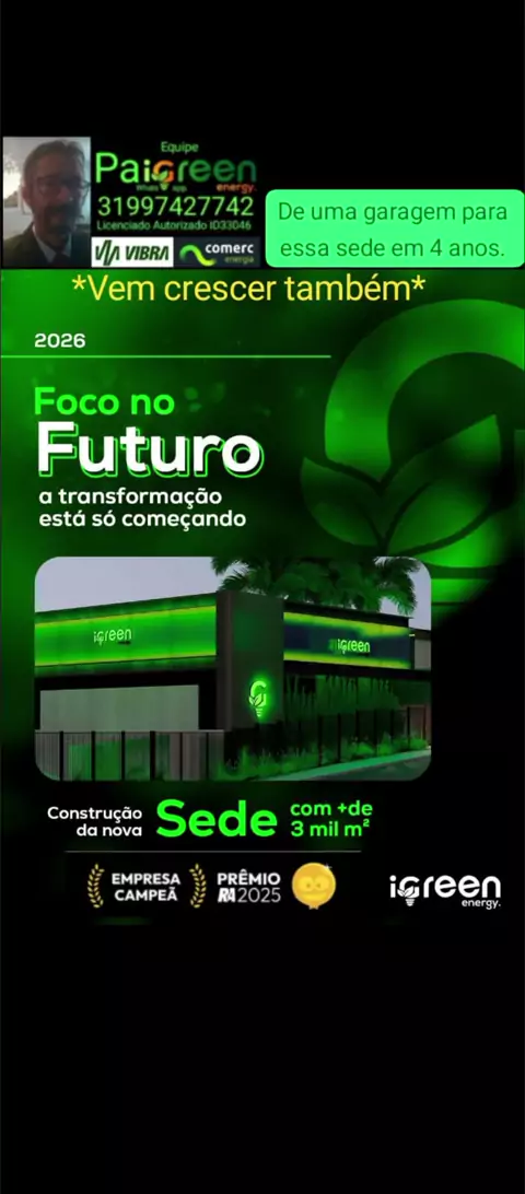 Sou Paulo Roberto da equipe PaigreenEnergy licençiado ,autorizado, certificado na igreen Academy da igreen Energy ID33046 Fazemos parte do *Patrocínio Responsável*. WhatsApp. 31 9 9742 7742 31 9 9105 1595. Estamos a disposição para acessora-las (los) para os benefícios e para o seu licenciamento. Atendemos em todo Brasil e com igreen Telecom nos USA. #