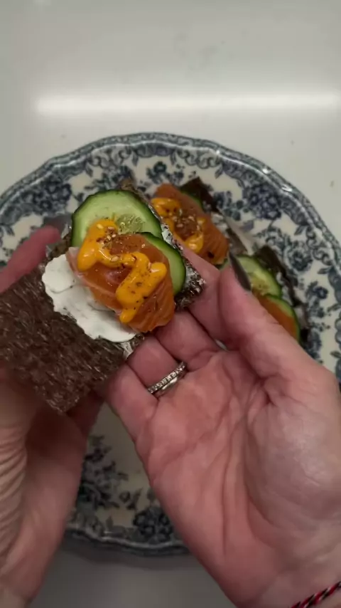 ⁺˚*・la ensalada de un loco・*˚⁺ ✶ en un mismo plato poner: ✶ queso cottage en el medio ✶ tomates cherry partidos en 3 ✶ 2 pepinillos agridulces ✶ a lo anterior echar: sal, ajo en polvo, cayena molida, pimienta negra ✶ añadir salmón ahumado al lado de los tomates ✶ 1 huevo poco cocido partido en 2 (con sal y pimentón) ✶ unas olivas ✶ chips de garbanzo o lentejas ✶ 1 hashbrown (decidme si queréis receta) ✶ queso feta por encima de todo ✶ 6min