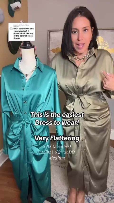 Respondendo a Decodificação dos Verdes! Olive vs. Peacock Green - vamos quebrar isso. Perfeito para casamentos, trabalho ou eventos especiais, este vestido de camisa é um divisor de águas. Pregas na frente para um ajuste lisonjeiro que esconde a barriga, e essa gravata frontal? Olá ampulheta! ⏳ ✨ # GreenFashion # DressDecoded # EstiloDicas # ModaExplicada