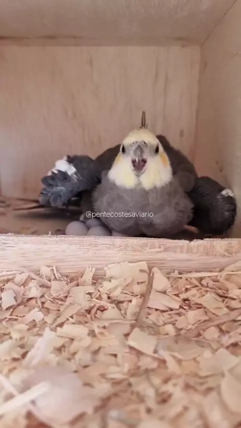 🐣✨ Cruzamento promissor no viveiro! ✨🐣 Temos um casal incrível em plena atividade! 💚 O macho cinza pastel face e a fêmea cinza cara amarela formaram um belo casal e já estão mostrando que a genética deles promete muito — o ninho já conta com 7 ovos! 🪺🔥 Esse cruzamento é especial, pois combina duas mutações muito apreciadas entre os criadores de calopsitas. A tendência é que nasçam filhotes com variações lindas, misturando a suavidade do tom pastel com o charme da face amarelada. 🐥💛