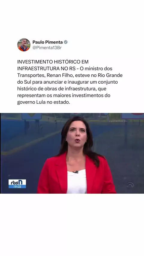 O ministro dos Transportes, Renan Filho, esteve no Rio Grande do Sul para anunciar e inaugurar um pacote histórico de obras de infraestrutura — os maiores investimentos do governo Lula no estado. São ações que geram empregos, fortalecem a economia e melhoram a mobilidade dos gaúchos. Destaque para a suspensão da cobrança de pedágio no Polo Rodoviário de Pelotas (BR-116/392), a partir de 3 de março de 2026, com nova concessão e redução de tarifas, beneficiando diretamente Pelotas, Rio Grande, Ca