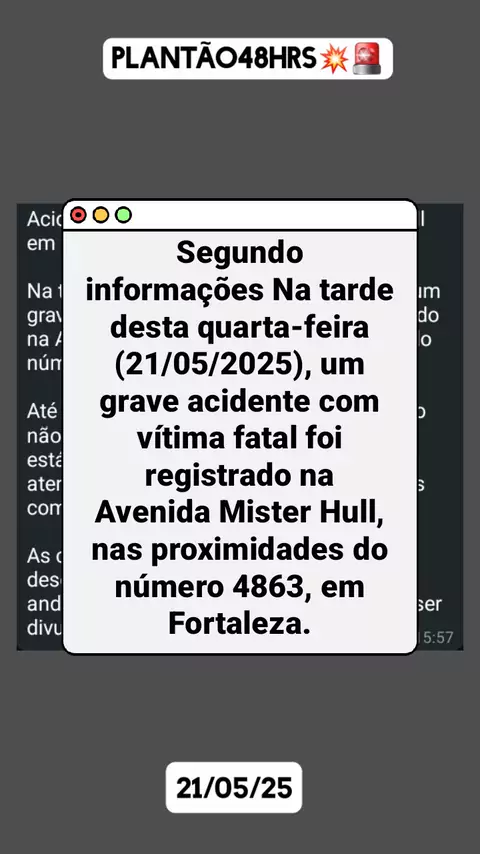 Acidente com vítima fatal na Av. Mister Hull em Fortaleza Na tarde desta quarta-feira (21/05/2025), um grave acidente com vítima fatal foi registrado na Avenida Mister Hull, nas proximidades do número 4863, em Fortaleza. Até o momento, a identidade do motoqueiro não foi confirmada. Uma equipe do SAMU está no local prestando os primeiros atendimentos e aguardando as autoridades competentes. #ceara3xmaisforte #ultranoticia #últimasnotícias #noticiasdeultimahora #acidente