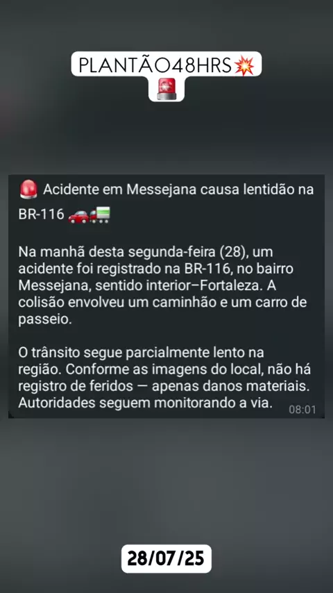 Na manhã desta segunda-feira (28), um acidente foi registrado na BR-116, no bairro Messejana, sentido interior–Fortaleza. A colisão envolveu um caminhão e um carro de passeio. O trânsito segue parcialmente lento na região. Conforme as imagens do local, não há registro de feridos — apenas danos materiais. Autoridades seguem monitorando a via. #flagrante #notícias #noticiasdeultimahora #últimasnotícias #acidente