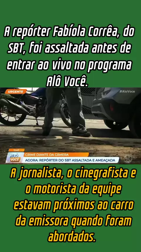 A repórter Fabíola Corrêa, do SBT, foi assaltada antes de entrar ao vivo no programa Alô Você, apresentado por Luiz Bacci. A jornalista, o cinegrafista e o motorista da equipe estavam próximos ao carro da emissora quando foram abordados por um criminoso armado no bairro Ipiranga, na Zona Sul de São Paulo (SP). #noticias #ultimasnoticias