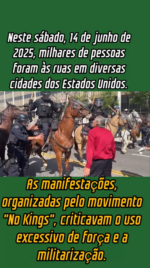 Neste sábado, 14 de junho de 2025, milhares de pessoas foram às ruas em diversas cidades dos Estados Unidos, como Los Angeles, Nova York e Washington, em protestos contra as políticas anti-imigração do presidente Donald Trump, especialmente as operações de deportação em massa conduzidas pelo ICE (Serviço de Imigração e Alfândega). As manifestações, organizadas pelo movimento "No Kings", criticavam o uso excessivo de força e a militarização das ruas, coincidindo com um desfile. #noticias