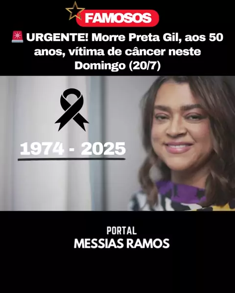 🚨O Brasil perdeu Preta Gil hoje (20/7), aos 50 anos, após uma batalha contra o câncer. Cantora, atriz e símbolo de força e alegria, ela deixa um legado de música, luta e representatividade. 📲Siga: @portalmessiasramos #noticias #famosos #pretagil #luto #informação