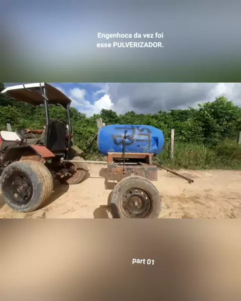 tudo invenção trator com motor de moto e caixa de marcha do Fox. carrocinha com engate sobre ela um tambor de 200L servindo de depósito para veneno para abastecer o pulverizador. A maioria dos ferros foi comprado em sucatas e reaproveitados. #invenção #engenhoca #engenharia