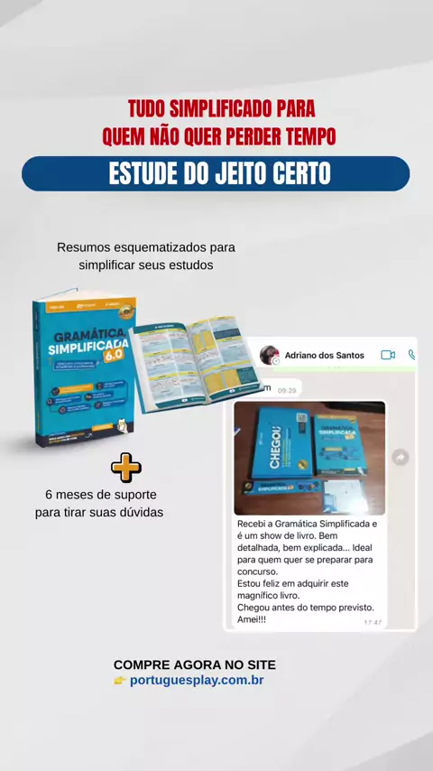 ❌ Estudar português e continuar errando nas provas cansa. ⏰ Falta tempo, o edital já saiu e o conteúdo parece não ter fim. ✅ A Gramática Simplificada 6.0 foi criada para quem quer aprender rápido, sem enrolação e focando no que realmente cai em prova. ✔️ Resumos esquematizados e coloridos ✔️ Explicações claras e objetivas ✔️ Ideal para concursos, vestibulares e revisões de última hora ✔️ Suporte para tirar dúvidas 💬 Quem compra, recomenda. 👉 Clique no link da bio e garanta a sua agora ⏳ E