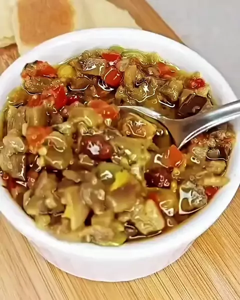 SALVA PARA MAIS TARDE 📌 Caponta de beringela! 😱 Essa é mais uma daquelas receitas cheias de memória afetiva pois sempre está presente nas festas de família! Lembro de ajudar minha mãe a fazer quando eu era criança. 3 cebolas grandes 1 cabeça de alho grande 1 pimentão vermelho grande 1 pimentão amarelo grande 3 pimentas dedo de moça sem semente 4 beringelas grandes 200g de azeitona 1 xic de uva passas 3/4 xic de amêndoas cortadas ao meio (você pode usar nozes ou castanhas também