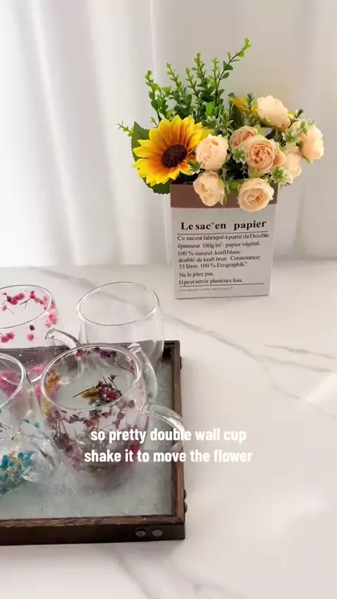 Xícara de Vidro Parede Dupla com flor seca 🌸 elegante p/ café, chá e decoração ✨ #ShopeeAchadinhos #CozinhaChic #ShopeeTop #kwai #KwaiChef2025
