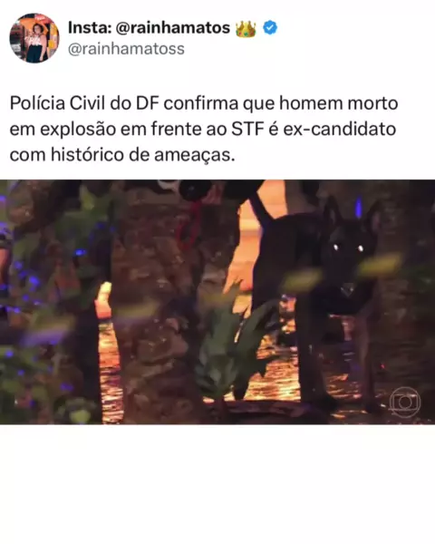 A Polícia Civil confirmou que Francisco Wanderlei Luiz, de 59 anos, ex-candidato a vereador e autor de postagens radicais, foi responsável por lançar explosivos no STF na quarta-feira (13). O veículo dele, que explodiu na Praça dos Três Poderes, estava carregado com artefatos, e em sua casa alugada em Ceilândia Norte foram encontrados mais explosivos. Autoridades apontam ligação com golpistas do 8 de janeiro. 📸 reprodução: TvGlobo 🦋