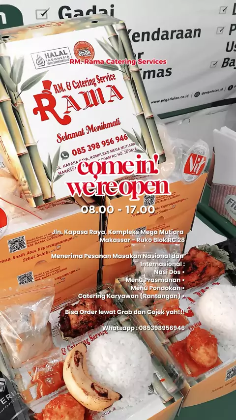 RM Rama Catering Service Buka Senin - Sabtu, Jam 08.00 - 17.00 Jl. Kapasa Raya, Kompleks Mega Mutiara Makassar - Ruko Blok RC 28. Menerima Pesanan Masakan Nasional dan Internasional : Рђб Nasi Dos Рђб Menu Prasmanan Рђб Menu Pondokan Рђб Catering Karyawan (Rantangan) Bisa Order lewat Grab dan Gojek yah!!! Whatsapp 085398956946 Ig : @rmrama_catering #cateringmurah #cateringhalal #cateringenak #cateringmakassar # #viral