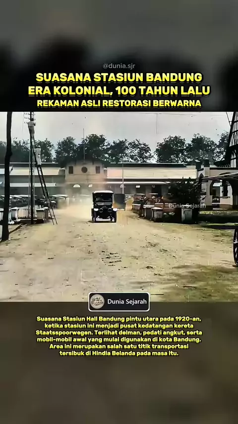 Suasana Stasiun Hall Bandung pada era 1920-an, ketika pintu utara menjadi titik utama keluar-masuk penumpang. Dibangun sejak akhir abad ke-19 dan berkembang pesat pada masa kolonial, Stasiun Hall menjadi simpul penting jalur kereta Staatsspoorwegen yang menghubungkan Batavia–Bogor–Cianjur–Bandung hingga Surabaya. Pada rekaman terlihat deretan delman, gerobak angkut, dan mobil-mobil awal seperti Ford yang mulai diperkenalkan di Hindia Belanda. Kerumunan pribumi, Indo, dan orang Eropa tampak meme...