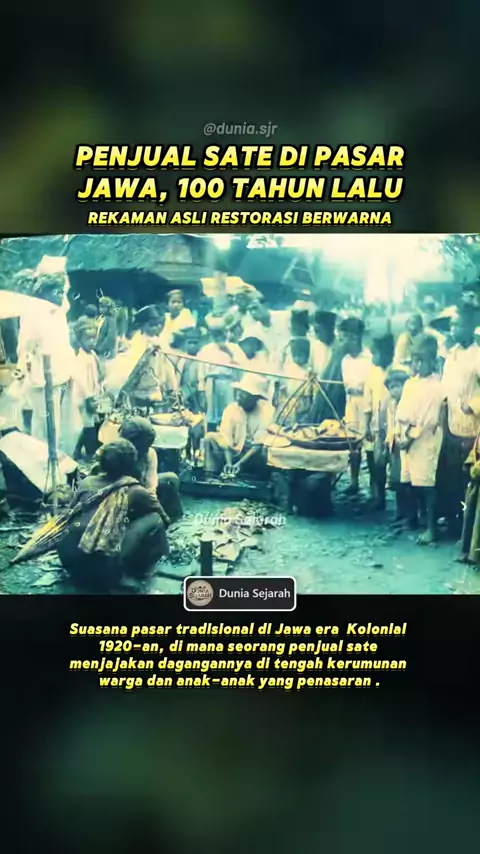 Suasana pasar tradisional di Jawa pada masa kolonial tahun 1920-an. Terlihat seorang penjual sate dengan pikulan khasnya, lengkap dengan arang dan peralatan membakar sate di tempat. Para warga, termasuk banyak anak-anak, tampak mengerumuni pedagang tersebut, sebuah pemandangan umum di pasar rakyat pada masa itu ketika sate menjadi salah satu makanan kaki lima paling populer. Dengan jalan berbatu, rumah-rumah beratap rumbia, serta hiruk-pikuk aktivitas pasar, gambar ini memberi gambaran autentik...