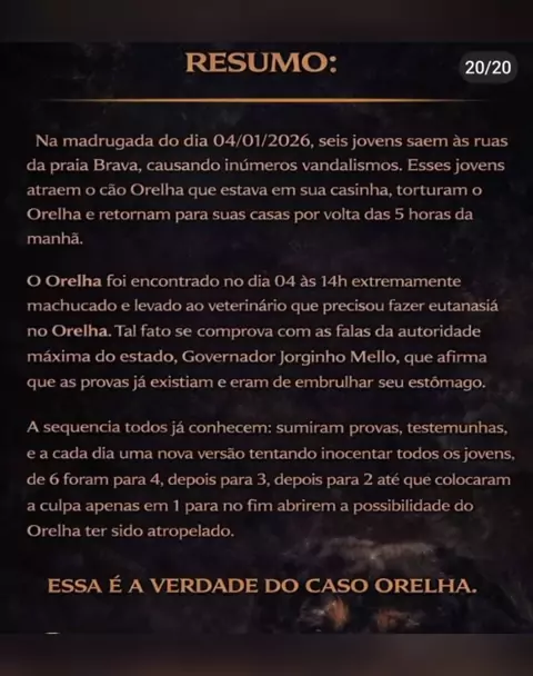 Chorei tanto só de ler sabe tanta revolta no caso cão orelha . judiação. justiça. quero que aqueles adolescente se lasque . quero que eles virem carne moída . não dá é. muito sofrimento dói muito