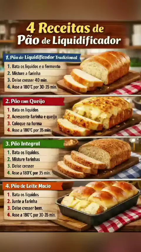 🥖 1) Pão de Liquidificador Tradicional 📝 Ingredientes 2 ovos 1 xícara (chá) de leite morno 1/2 xícara (chá) de óleo 2 colheres (sopa) de açúcar 1 colher (chá) de sal 1 envelope (10g) de fermento biológico seco 3 xícaras (chá) de farinha de trigo 👩‍🍳 Modo de preparo Bata no liquidificador: ovos, leite, óleo, açúcar, sal e fermento. Despeje em uma tigela e misture a farinha aos poucos. Coloque em forma untada. Deixe crescer por 40 minutos. Asse a 180°C por 30–35 minutos. 🧀 2) P
