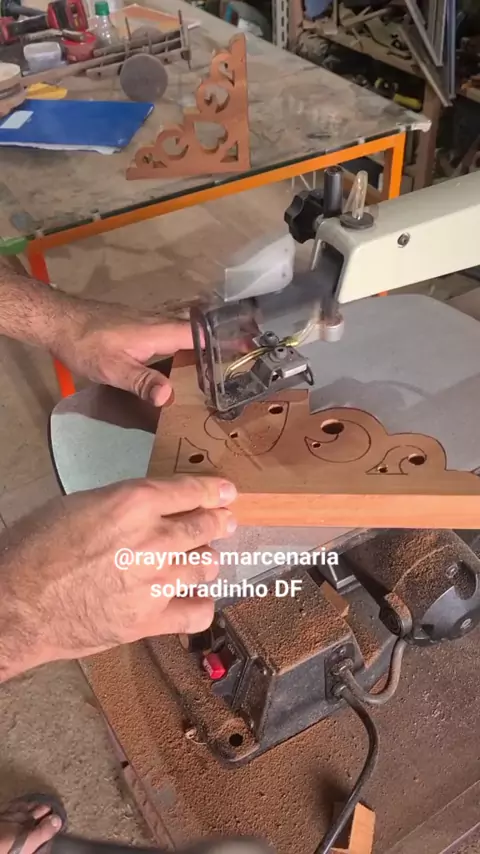 fazendo cortes curvos na serra tico-tico de bancada, mão francesa decorativa usando madeira reciclada mogno #marcenaria #maofrancesa #artesanato #prateleiras #madeiradereuso