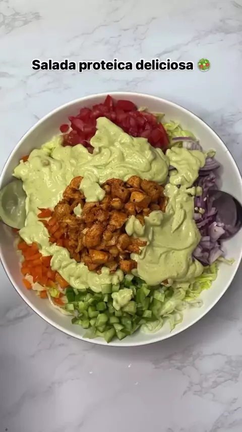Salada proteica com molho de abacate 🥑🥗 Quer perder de 4 a 6kg com uma dieta gostosa e saudável, com aquilo que você gosta e sem frescura? CLIQUE NO LINK DA BIO para receber nossas receitas!😍 Ingredientes: • 1 alface • 1 cebola roxa • 4 pepinos • 3 tomates • 1 pimentão doce • peito de frango ( temperado com páprica, sal e pimenta) Para o Tempero: • 1 abacate • 1 colher de sopa de maionese • 1 colher de chá mostarda Dijon • suco de 1 limão • sal e pimenta #fy #receitasfit