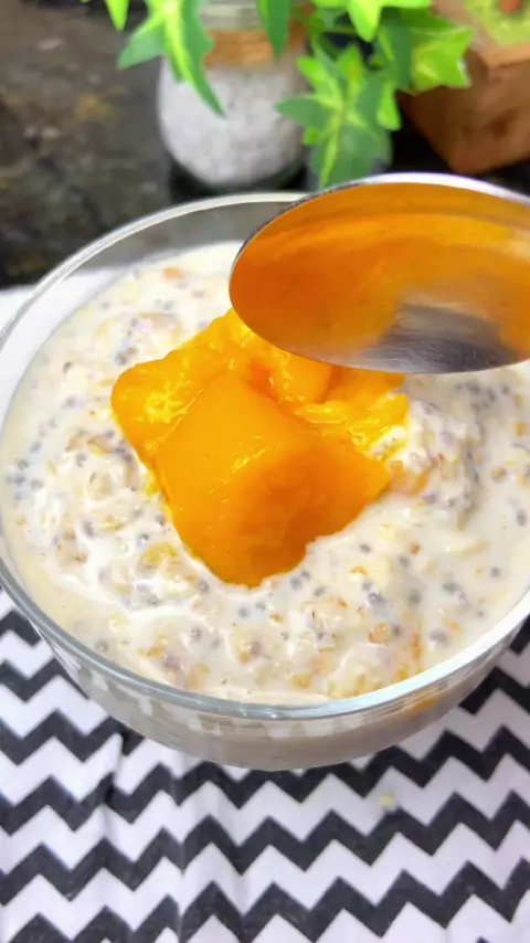 Overnight Oats ou aveia amanhecida Ingredientes: 2 xic. de avela em flocos 2 col. de chia 2 xic. de leite 1 col. de mel ou 6 gotas de adocante 2 mangas ou fruta de sua preferência 1 copo de iogurte natural Opcional 2 col. de leite em pó ou whey #paocaseiro #receitasfaceis #overnightoats #aveiamanhecida