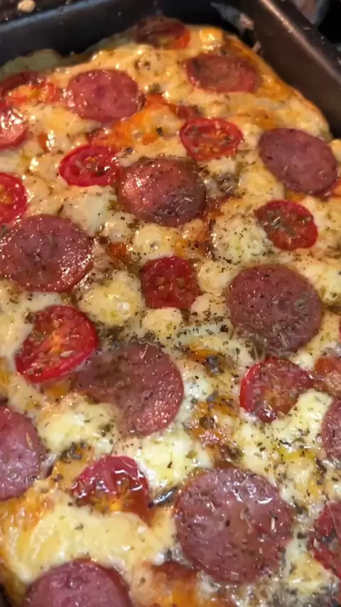 Ingredientes: 3 ovos 1/2 xícara de óleo 1 xícara de leite Temperei com: mix de pimentas, mix tempero e 1 colher de chá de sal 2 xícaras de farinha de trigo 1 colher de sopa de fermento em pó Finalizaçãod Molho de tomate 200g de queijo mussarela 1/2 linguiça calabresa em rodelas Tomate Orégano